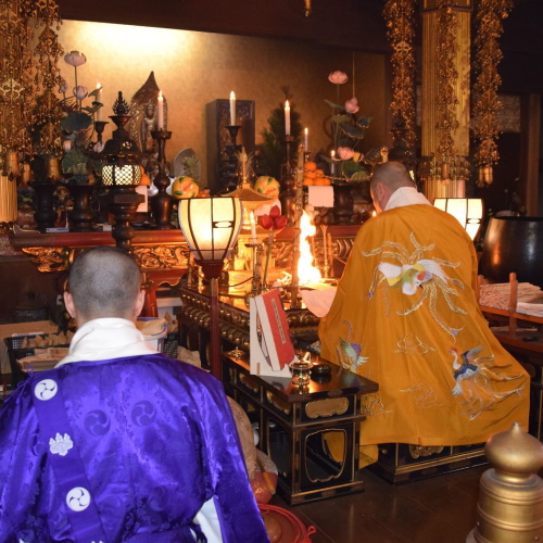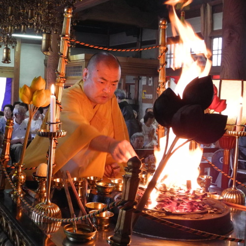 護摩木にお願い事や供養したい方の名前を書き、本尊様の前で焚き上げることで祈りを捧げます。法要後、お加持と短い法話があります。開催時間は一時間ほどです。